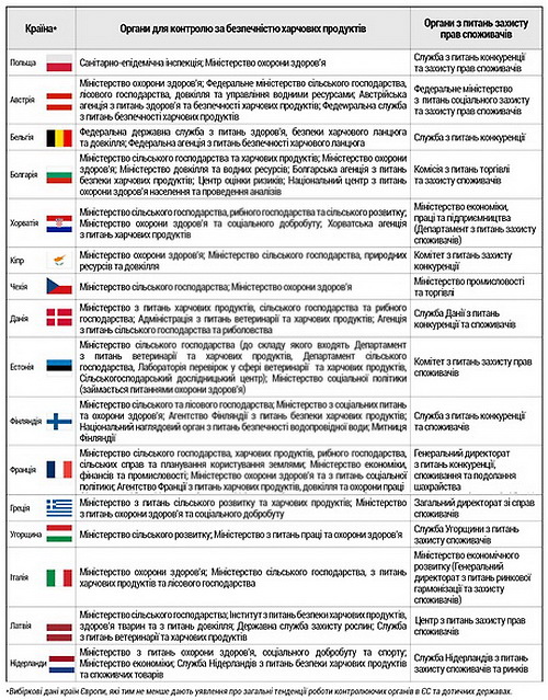 Ніде немає універсального органу, який би поєднував питання контролю за якістю та безпечністю харчової продукції з функціями забезпечення захисту прав споживачів в цілому. Так, як це запропоновано зробити в Україні. В Європі існує чітке розмежування, діють окремі органи.