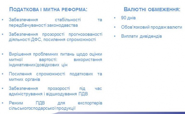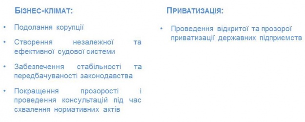 Зокрема, наші партнери передусім відзначили досягнення стабілізації макроекономічної ситуації, збалансованості державного бюджету, здійснення заходів, спрямованих на дерегуляцію господарської діяльності, децентралізацію, удосконалення системи державних закупівель і технічного регулювання, реформування банківського та газового секторів і державних підприємств, спрощення митних процедур тощо.