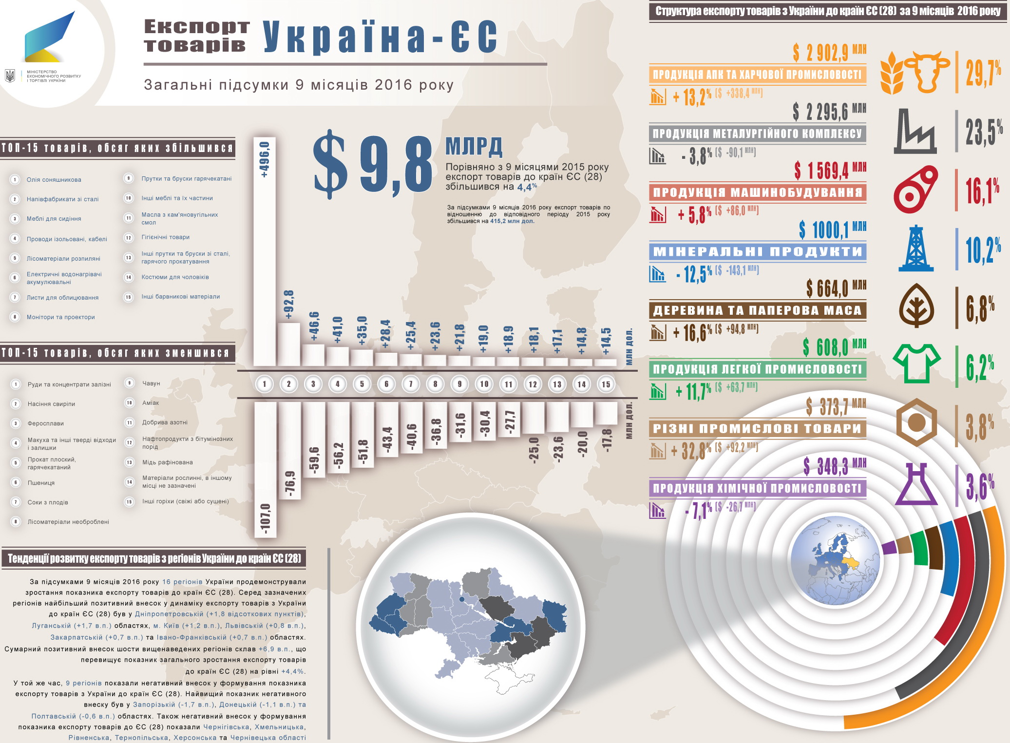 Евросоюз стал главным торговым партнером Украины. На него приходится уже 41% в нашей внешней торговле товарами. По результатам 9 месяцев 2016 года товарооборот вырос на 6%, при этом наш экспорт в Евросоюз увеличился на 4,4%.