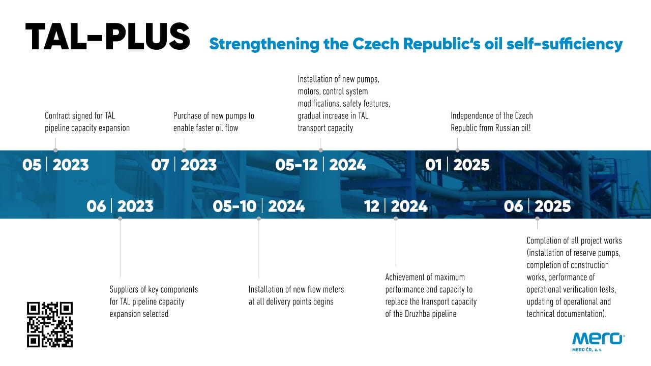 Модернізація нафтопроводу отримала зелене світло. Важливу роль у просуванні проєкту відіграла державна компанія MERO ČR – оператор чеської частини нафтопроводу, яка активно лобіювала інтереси модернізації, беручи участь у міжнародних переговорах із партнерами з консорціуму TAL.