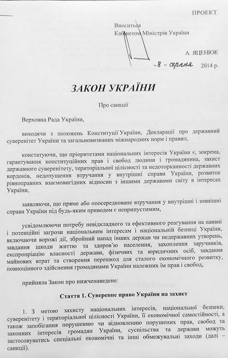 Представители Кабинета министров продемонстрировали журналистам текст проекта закона "О санкциях", который был принят на закрытом заседании правительства в пятницу 8 августа.