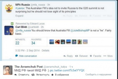 Министр иностранных дел Швеции Карл Бильдт указал на ошибки в официальном Twitter-аккаунте МИД Российской Федерации.