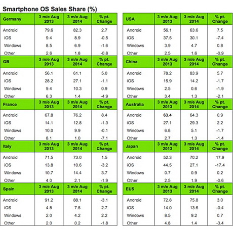 Несмотря на явные ожидания сентябрьской премьеры новых iPhone 6, доля Apple по продажам смартфонов за три месяца до августа оставалась стабильной и просела всего на 0,4 % в годовом исчислении в пяти крупнейших европейских странах (Германии, Великобритании, Франции, Италии и Испании).