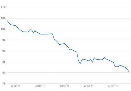 Данные лондонской бирже ICE ICE Futures также отображают снижение цены нефти. Утром 13 ноября фьючерсы на нефть марки Brent торгуются около отметки $80 - несколько раз за последние 12 часов цена падала ниже этого уровня, а потом - снова повышалась.