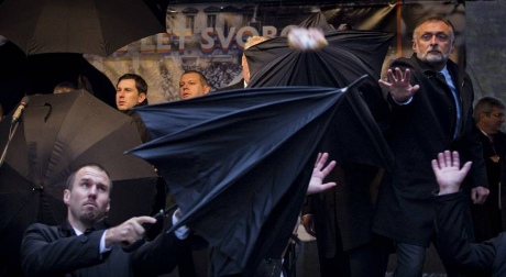 Вскоре из толпы на сцену полетели яйца. Охрана попыталась защитить президентов зонтиками.