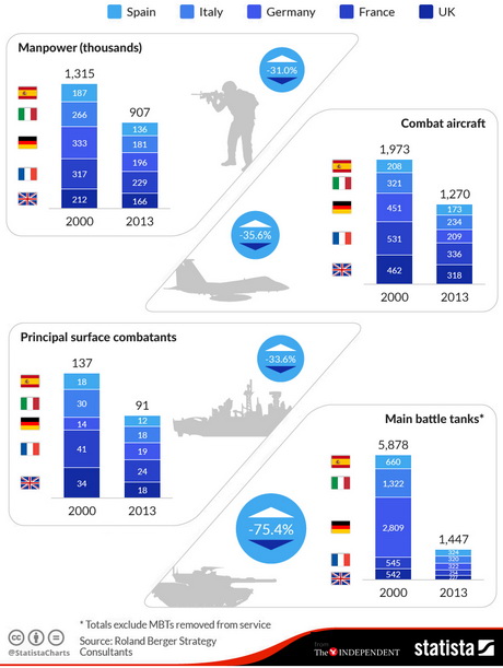 Количество танков на вооружении пяти крупнейших стран ЕС снизилась на 75,4% с 2000 по 2013 год.