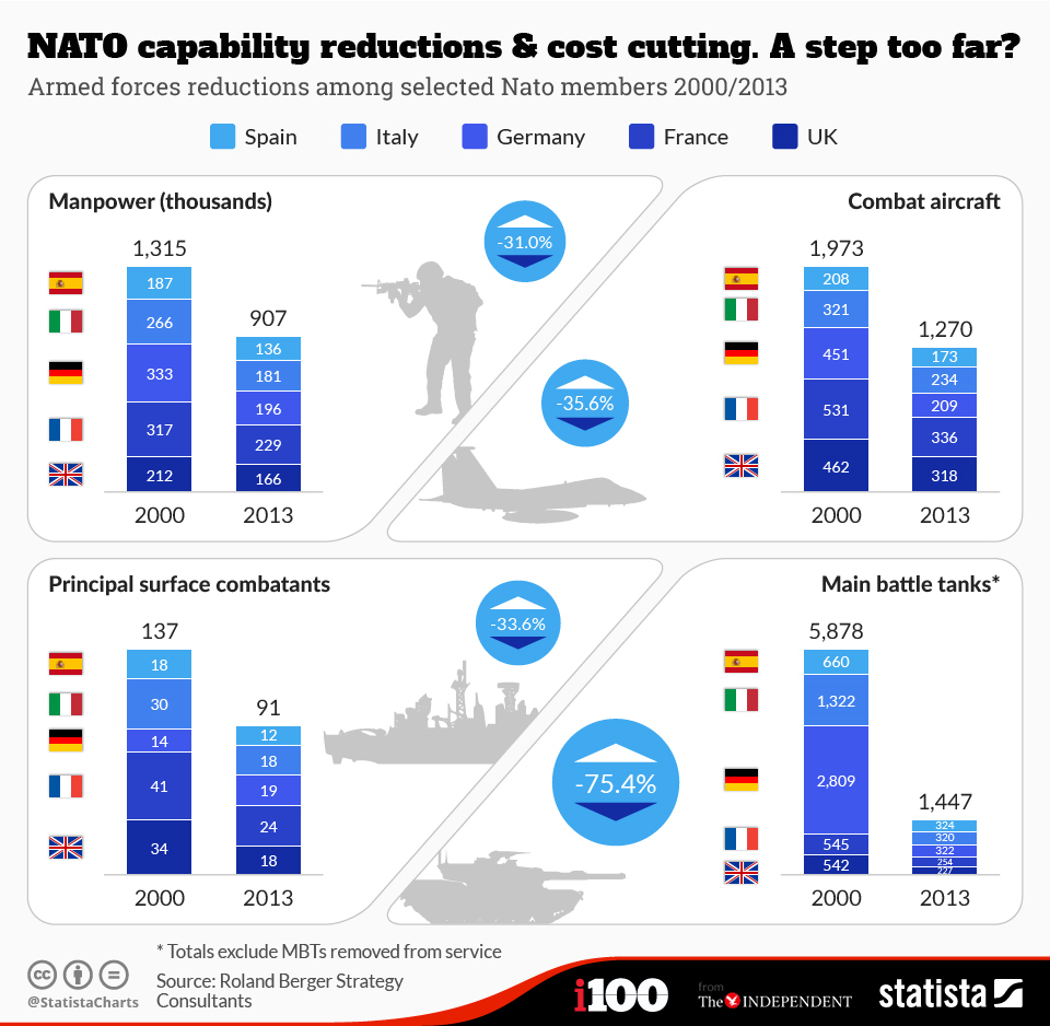 Наибольшие "потери" понесла бронетехника на вооружении ФРГ - количество немецких танков сократилось с 2809 в 2000 году до 322 единиц в 2013 году.