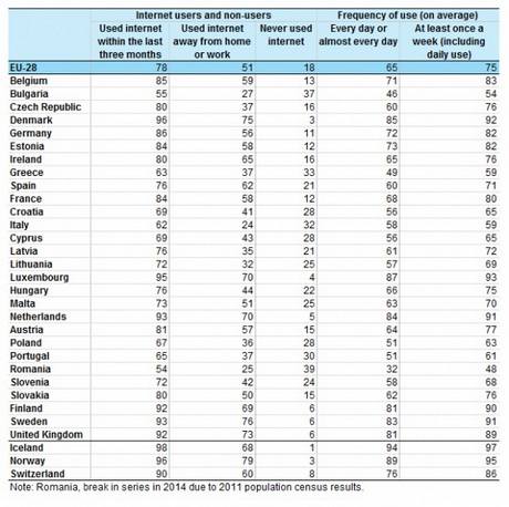 В Исландии людей, которые никогда не пользовались интернетом лишь 1%, в то время как 94% жителей этой страны пользуются сетью ежедневно. В Норвегии, Дании и Люксембурге тех, кто никогда не пользовался интернетом, менее 5%. В Британии таких 6%.