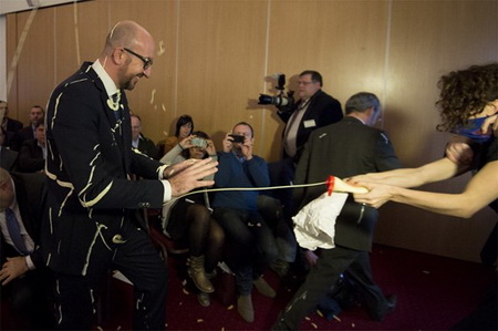 К премьеру подбежали две женщины и с криком "Долой жесткую экономию!" осыпали Мишеля картошкой фри, а потом облили его майонезом из тюбика.