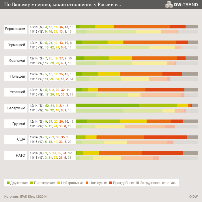 В частности, если в ноябре 2013 года 60% россиян называли ФРГ другом или партнером, то в декабре 2014 такого мнения придерживались лишь 26% респондентов.