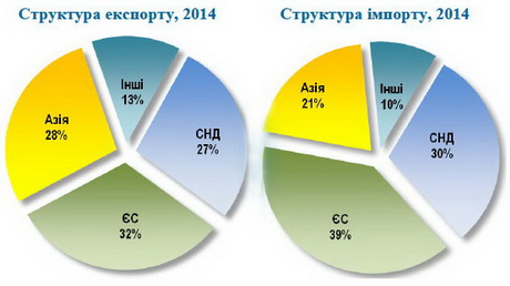 В 2014 году товарооборот Украины перераспределился. Первое место заняли страны Евросоюза - 35,5%, На втором месте с 29% - страны СНГ. Доля стран Азии - 24%.