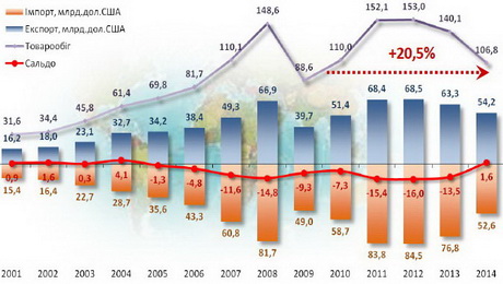 Экспорт товаров из Украины по итогам 2014 года составляет 54,2 млрд. грн, что меньше предыдущего 2013 года на 14%. Если рассматривать динамику по годам, то экспорт 2014 уменьшился только в сравнении с 2008 и 2011-2013 годами.