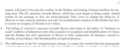 Киев приводит также несколько позиций, которым, по мнению Украины, должен следовать Совет ЕС. В частности, украинская сторона в нескольких формулировках предостерегает Европу от смягчения санкций с целью "договориться с Путиным".
