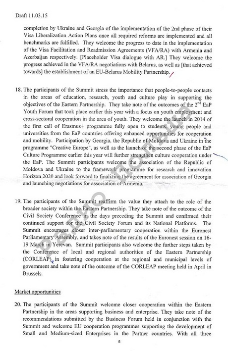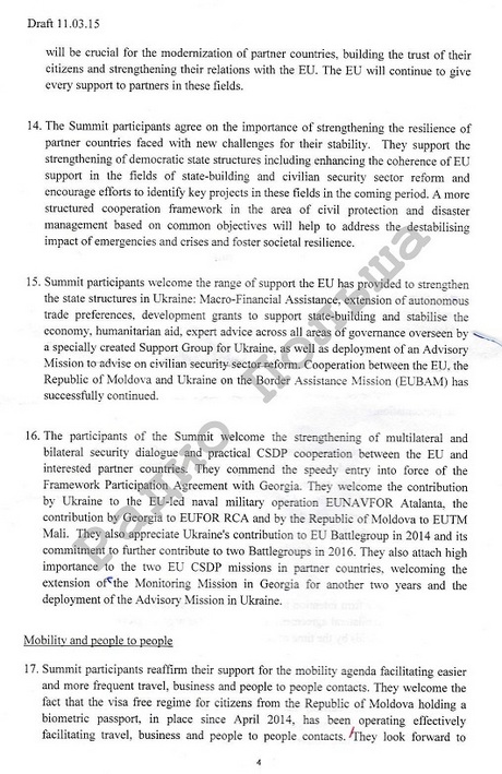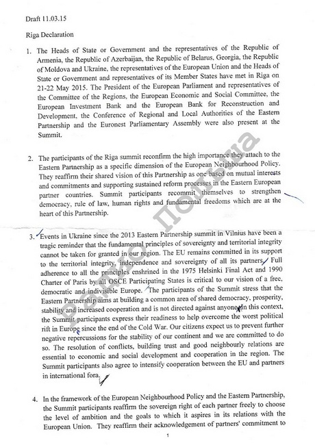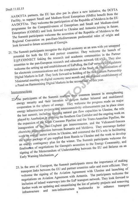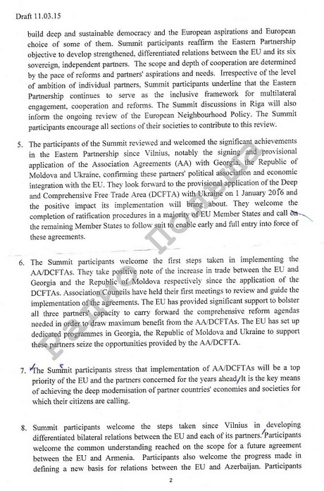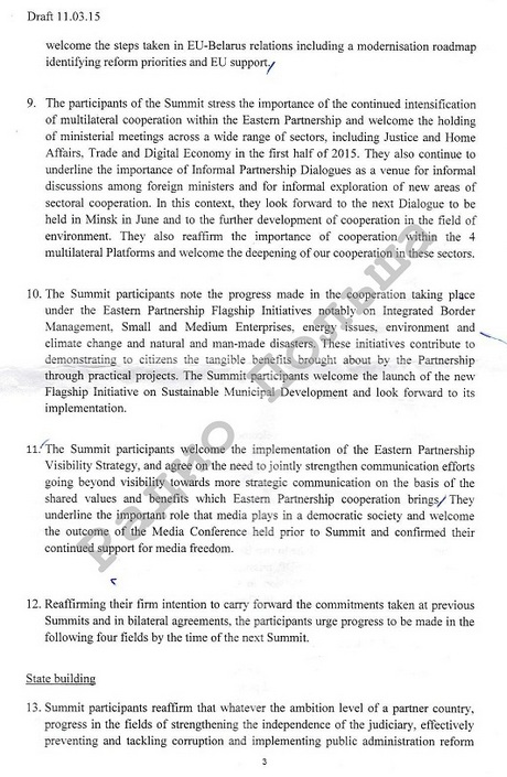 В редакции проекта декларации, датированной 11 марта, ничего не говорится о европейской перспективе. Речь идет только о европейском выборе Украины, Грузии и Молдовы.