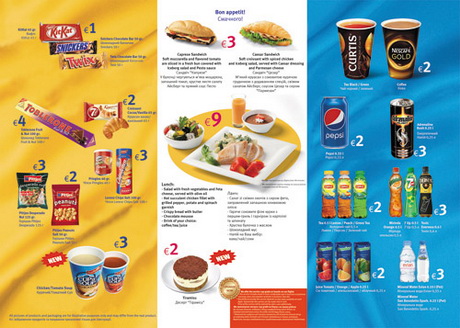 Актуальное меню продуктов, которые продаются во время полета, сейчас включает горячий завтрак на рейсах более 90 минут, сэндвичи, десерт, снеки и напитки.