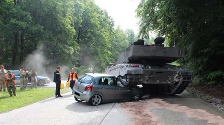 ДТП произошло в немецкой коммуне Аугустдорф (север Германии). Танк переехал капот машины, фактически уничтожив легковое авто. За рулем автомобиля находилась 18-летняя девушка, которой чудом удалось избежать серьезных травм.
