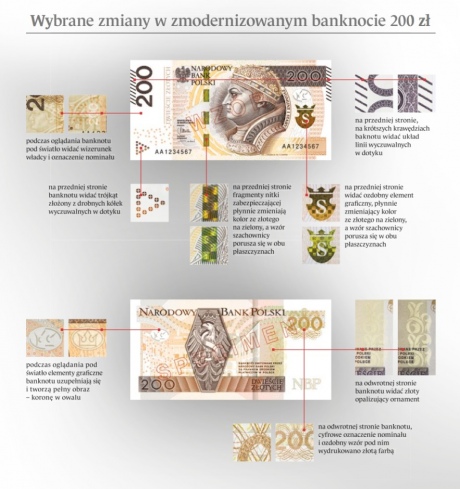 "Модернизация 200 злотых завершит процесс модернизации банкнот, циркулирующих в обращении с 1995 года" - сообщили в Нацбанке Польши, отметив, что уровень защиты банкноты будет одним из самых современных в мире.