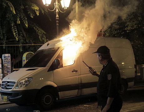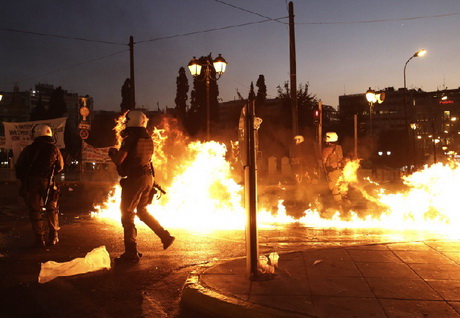 Демонстранты, недовольные намерениями греческого правительства пойти на уступки в вопросах реформ по требованиям кредиторов, начали бросать в полицейских бутылки с зажигательной смесью.