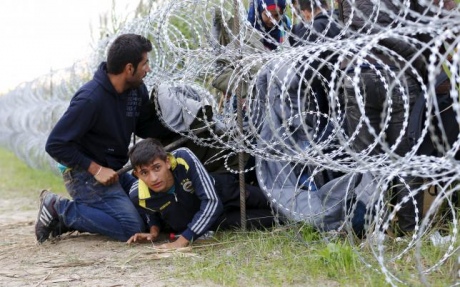 | Сирийские беженцы пролезают под забором на венгерско-сербской границе близ поселка Роске (фото Reuters) |