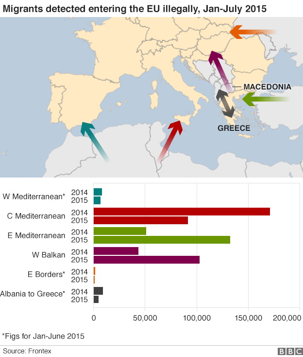 Больше всего нелегалов в Европу в 2015 году прибывает через восточное Средиземноморье (около 120 тысяч), тогда как в прошлом году ехали в основном через Италию и Грецию.