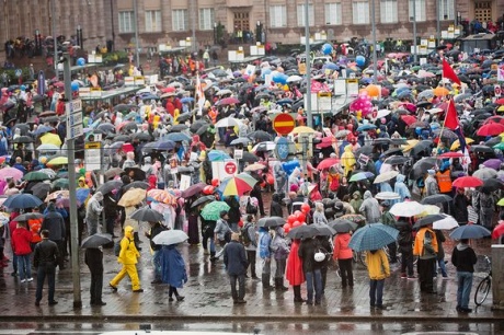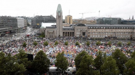 На протестную акцию в центре Хельсинки, которая началась в 11.00, вышло более 30 000 человек, которые прибыли в столицу из разных уголков Финляндии.
