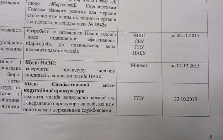 В частности, в документах отмечается: чтобы избежать срыва выполнения ПДВЛ, генпрокурор Виктор Шокин "до 23 октября" должен "заменить членов конкурсной комиссии от Генпрокуратуры на лиц, не являющихся политиками и госслужащими".