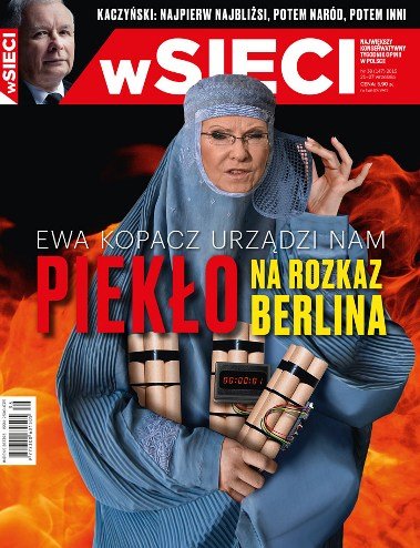 На обложке журнала Эва Копач изображена в виде джихадистки с взрывчаткой в руках. Материал о беженцах с изображением главы польского правительства было размещено под названием "Эва Копач организует нам ад по воле Берлина".