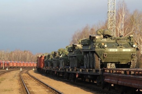 Техника – 13 боевых машин пехоты Bradley и другие транспортные средства, прибывшие в военный городок Рукла на железнодорожных платформах.