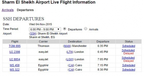 Согласно данным онлайн-табло аэропорта Шарм-эль-Шейха, сегодня вечером в Британию должны были улетать три рейса – два в Лондон и один в Манчестер. На табло указано, что рейсы в британскую столицу задерживаются.