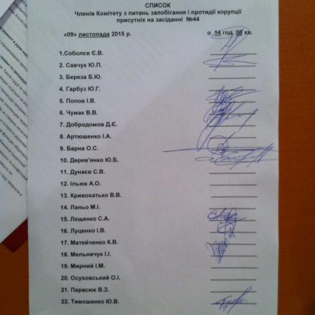 На комитете отсутствуют депутаты: Береза, Парасюк, Матейченко (НФ), Осуховский (Свобода), Кривохатько (БПП), Гарбуз (БПП), Мирный (начальник охраны Фирташа, ОБ), Артюшенко (БПП), Дунаев (ОБ), Ильюк, Ланьо.