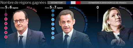 Как сообщала Европейская правда, после первого тура партия Марин Ле Пен получила около 27,96% голосов и победила в 6 из 13 административных округов. Республиканцы, возглавляемые экс-президентом Николя Саркози получили 26,89%. На третьем месте оказалась Социалистическая партия нынешнего президента Франции Франсуа Олланда с 23,33%.