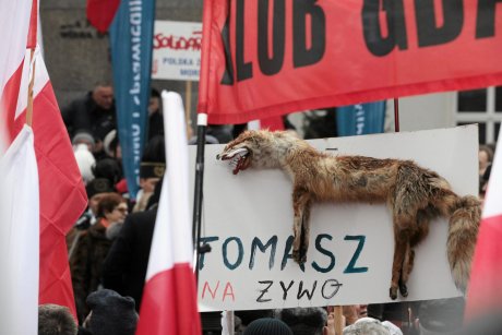 Авторскому же замыслу сторонников "Пис" стал мертвый лис с надписью "Томаш вживую".