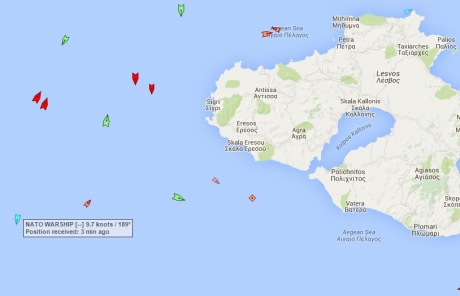 | Один из кораблей НАТО возле греческого острова Лесбос (нажмите для увеличения) |