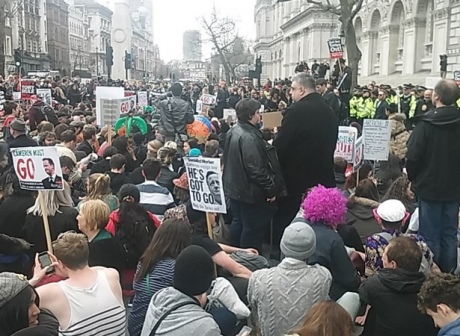 Протестующие прошли шествием по правительственной улице, держа плакаты с лозунгами об отставке Кэмерона и скандируя соответствующие лозунги.