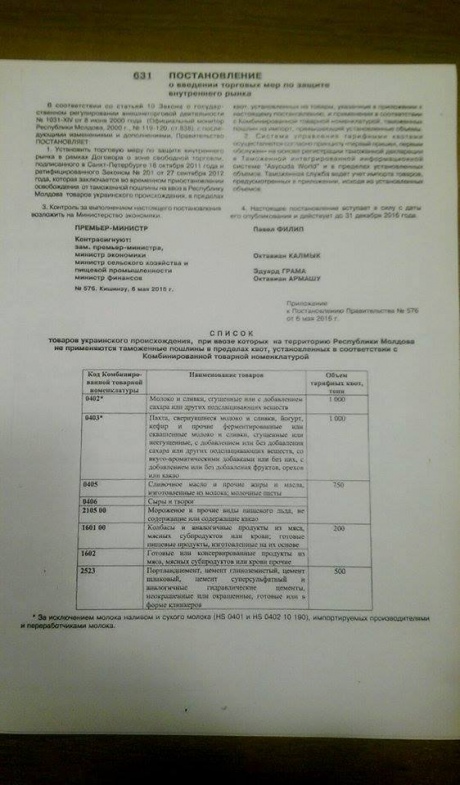 Введение квот в правительстве Молдавии объяснили запросу со стороны местных производителей. В пояснительной записке также говорится, что в прошлом году объем импорта украинской молочной продукции (сметаны, кефира, йогуртов) вырос в 1,5 раза, мясной продукции — в 14 раз, а цемента — в шесть раз.