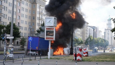 Сегодня в Берлине на площади Фридрихсхайн грузовик столкнулся со скутером, после чего автомобиль загорелся.