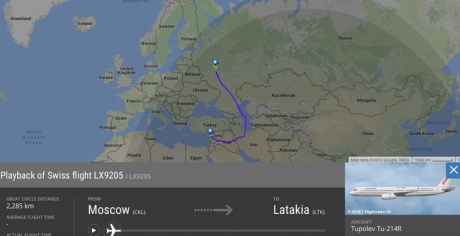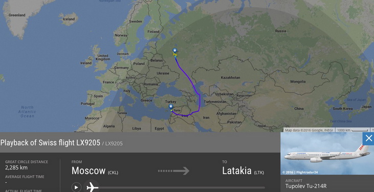 Согласно данным полетов, самолет Ту-214Р вылетел из Москвы в Латакию 29 июля и приземлился в тот же день на сирийской территории.