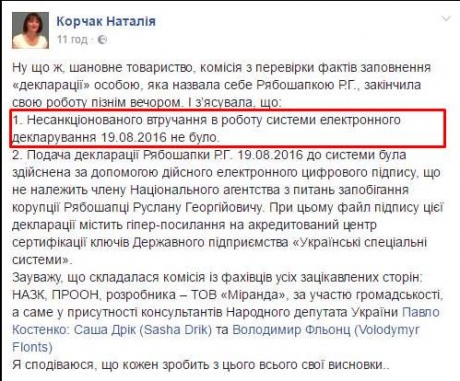 В выводах комиссии НАПК говорится, что взлома системы е-декларирования не было, однако подтверждается, что фальшивая декларация от имени Рябошапки была внесена при содействии государственного предприятия "Украинские специальные системы".