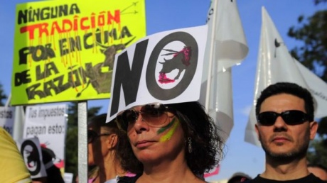 Как пишет BBC, митингующие держат плакаты "коррида - школа жестокости", а также "коррида - национальный позор".