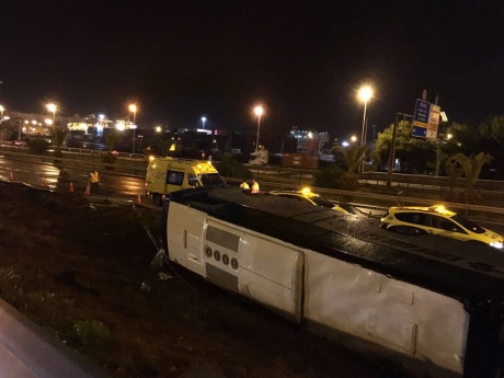 Авария произошла около трех часов ночи на кольцевой дороге города, когда автобус вез туристов в аэропорт Барселоны. После ДТП водитель и 23 туриста были доставлены в больницу.