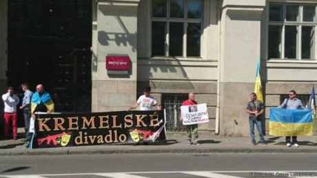 Кроме того, под стенами отеля, где проходило мероприятие, состоялась демонстрация против "центра". Около десятка активистов собрались возле отеля с флагами Евросоюза и Украины и с плакатами: "Кремлевский театр", "Не хотим террористической организации ДНР в Чехии" и "Чешская марионетка на службе у тоталитарного Мордора".