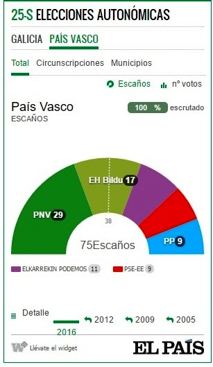 Баскские "сепаратисты" (EH Bildu) получают 21,23% голосов и могут иметь 17 мест. Далее идут Podemos - 11 мест, социалисты (PSE EE) и Народная партия (PP) - по 9 мест в местном парламенте.