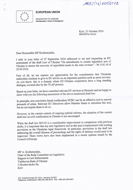 В связи с этим, представитель ЕС подчеркивает, что "в контексте судебной реформы, которая продолжается, принятия нынешнего проекта о конфискации в гражданско-правовом порядке в Украине не является желательным...".