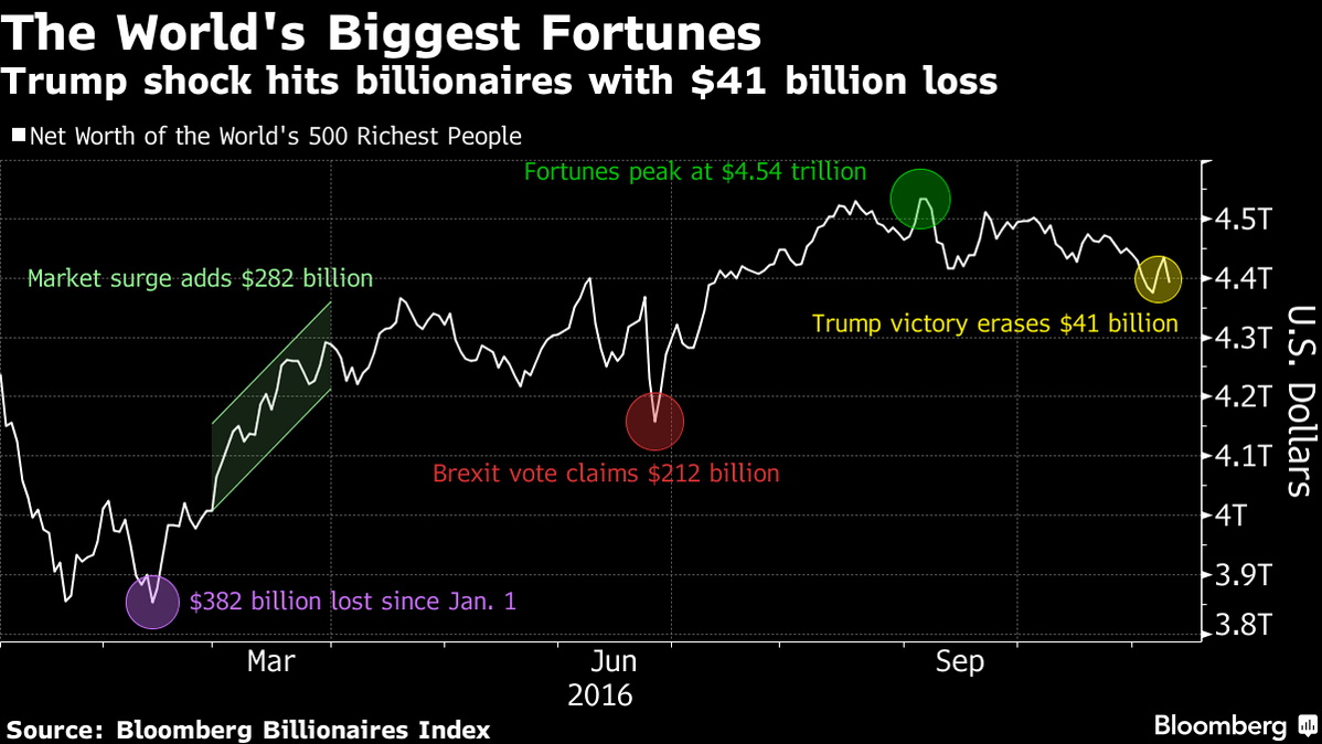 Падение индексов фактически нивелировало совокупный рост в $57 млрд. самых богатых людей в мире, который произошел в начале недели, когда рынки выросли на ожиданиях, что Клинтон победит на выборах.