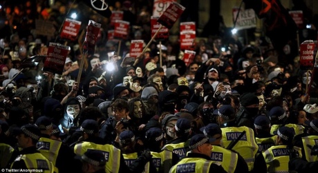 Спецподразделения полиции Лондона столкнулись с сопротивлением участников антиправительственной акции, организованной хакерской группой Anonymous, в результате столкновений были задержаны около 50 участников акции.
