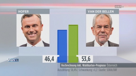 По данным предварительного подсчета голосов, Ван дер Беллен получил поддержку 53.6% избирателей, Хофер – 46,4%. Подсчет голосов, поступивших по почте еще продлится, но на предыдущих турах избиратели, голосовавшие по почте, поддерживали Ван дер Беллена со значительным преимуществом.
