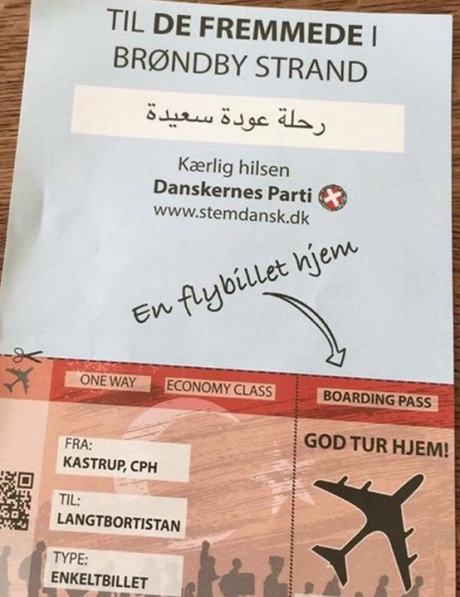 Открытки были сделаны в виде авиабилетов "чужакам/иностранцам в Брондбю Странд (район в Копенгагене), с любовью от Партии датчан".