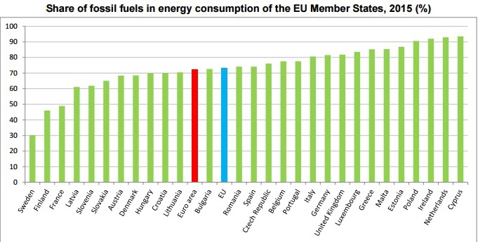 Тем не менее, подавляющее большинство государств-членов по-прежнему сильно зависят от ископаемых видов топлива. В 2015 году ископаемые виды топлива составляли менее половины энергопотребления только в трех странах ЕС: Швеции (30%), Финляндии (46%) и Франция (49%).