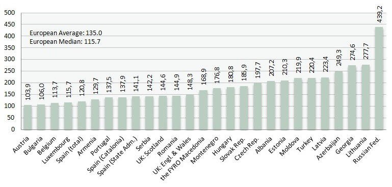 Показатель России почти в четыре раза выше, чем медианный показатель среди стран-членов Совета Европы (115 заключенных на 100 тысяч населения).