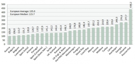 Далее идут Литва (278), Грузия (275), Азербайджан (249.3), Латвия (223.4), Турция (220.4) и Молдова (219.9).